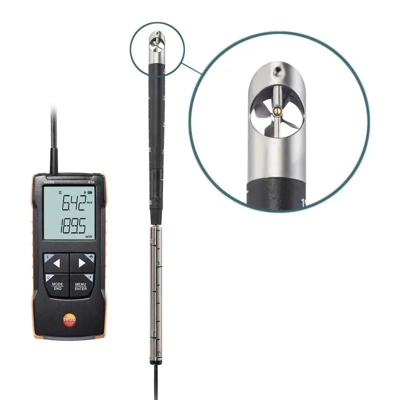 Анемометр Testo 416 New — это современный прибор для точного измерения скорости воздушного потока, предназначенный для использования в различных сферах, включая вентиляцию, кондиционирование и аэродинамические исследования. Его ключевой особенностью является высокая точность измерений, обеспечиваемая минимальной погрешностью, не превышающей ±(0,2 м/с + 1%). Это делает устройство надежным инструментом при проведении профессиональных исследований и технического обслуживания инженерных систем.