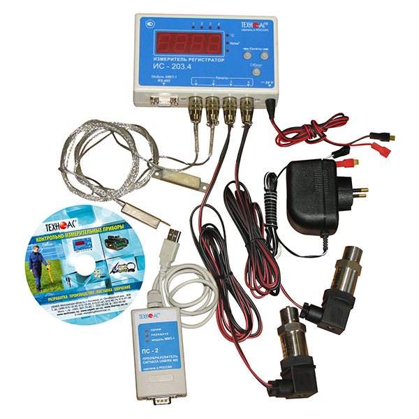Комплект состоит из четырехканального измерителя-регистратора, позволяющего сохранить в памяти 15000 значений по каждому каналу с интервалом от 5 сек. до нескольких часов, что позволяет вести замеры и хранить данные за период до 1 года.