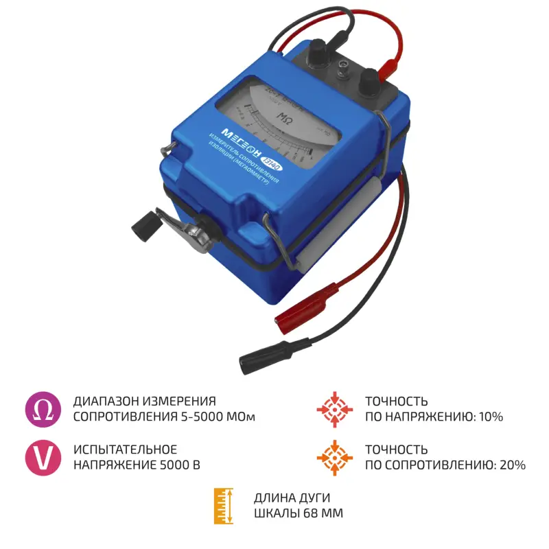 Испытательное напряжение в 5000 В обеспечивает надежное выполнение измерений, позволяя точно оценивать состояние изоляции. Погрешности по напряжению и сопротивлению составляют 10% и 20% соответственно, что гарантирует достаточный уровень точности для большинства практических приложений. Длина дуги шкалы, равная примерно 68 мм, облегчает считывание значений, что особенно важно в условиях, когда время имеет значение.