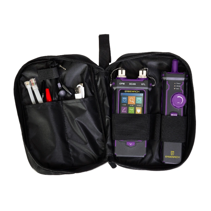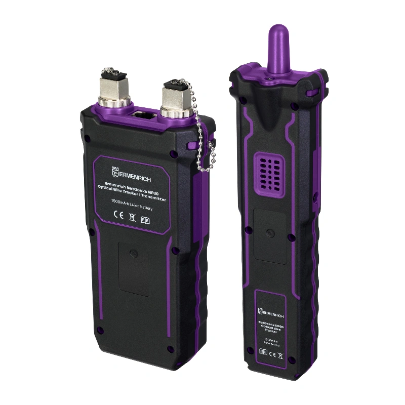 Многофункциональный кабельный тестер Ermenrich NetGeeks NP60 - это универсальный инструмент для диагностики, сочетающий кабельный тестер, измеритель длины и оптический мультиметр. Он разработан для специалистов, работающих с сетями на витой паре и оптоволокном. В комплект входят передатчик и приёмник, каждый из которых выполняет свои функции в процессе диагностики.