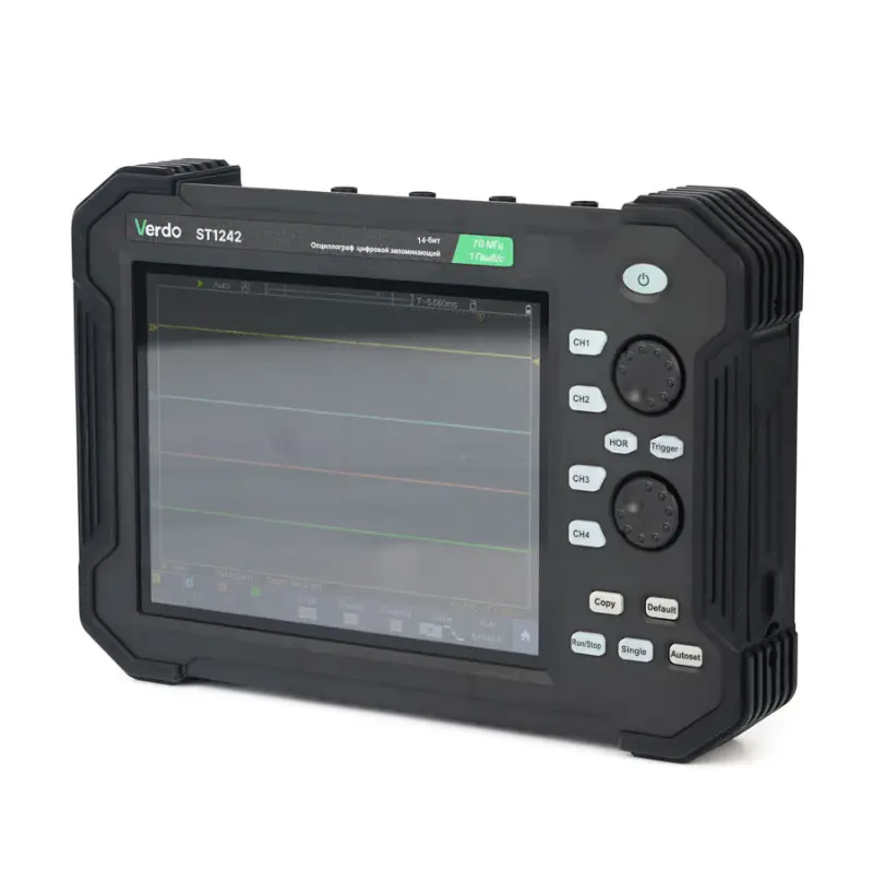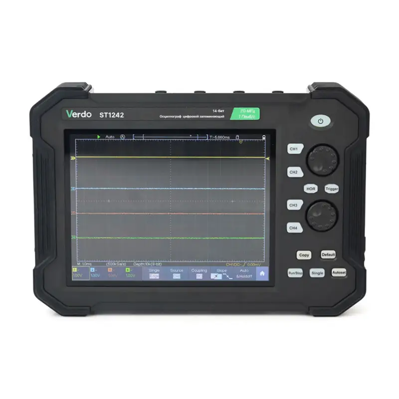 С четырьмя каналами, VERDO ST1242 позволяет одновременно анализировать несколько сигналов, что значительно упрощает процесс диагностики и тестирования. Полоса пропускания в 70 МГц гарантирует, что устройство способно захватывать широкий спектр частот, что особенно важно при работе с высокочастотными сигналами. Частота дискретизации в 1 Гвыб/с обеспечивает высокую точность и детализацию осциллограмм, что позволяет выявлять даже самые мелкие изменения в сигнале.