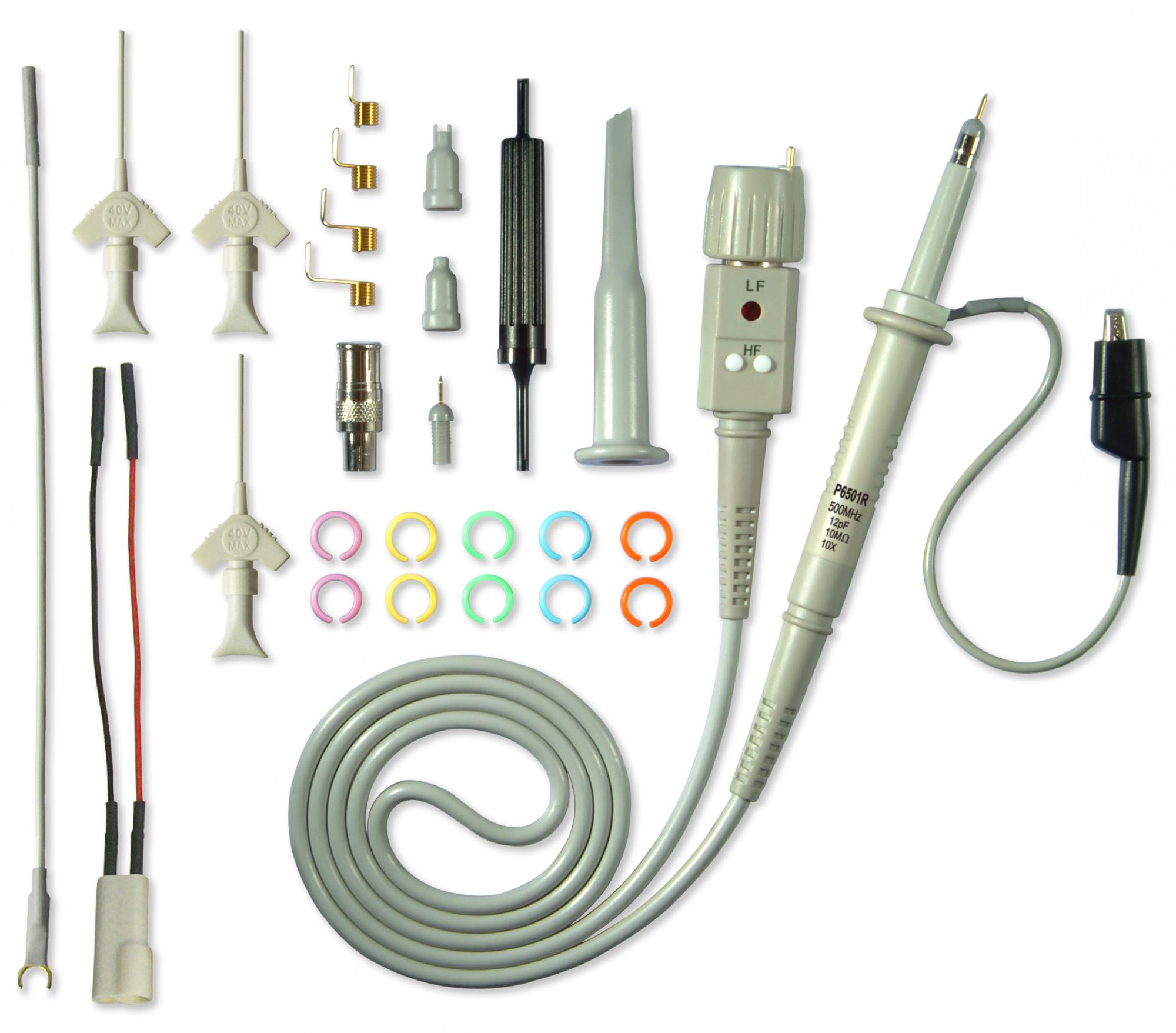 Пассивный пробник 500 МГц, 1:10, время нарастания 0,7 нс, 10 МОм/ 12 пФ, автодетектирование осциллографом, длина кабеля 1,2 м, аксессуары: 3 микрозажима + 3 комплекта насадок., макс. до 600 В кат.I, до 300 В Кат II (DC+peak AC) категория снижается с частотой