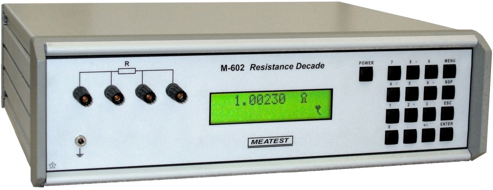 Программируемый декадный магазин сопротивлений M-602/М-602А предназначен для поверки омметров и термометров с температурными датчиками сопротивления Pt и Ni. Декадный магазин оптимально подходит для автоматизированного испытания термоэлементов, основанном на моделировании платиновых и никелевых термометров сопротивления. Благодаря хорошей точности и возможности дистанционного управления M-602 может быть использован в поверочных лабораториях, поточных линиях, сервисных центрах и отделах опытно-конструкторских работ. Для использования прибора в промышленности спроектирована версия в 19" модуле с высотой 3HE.