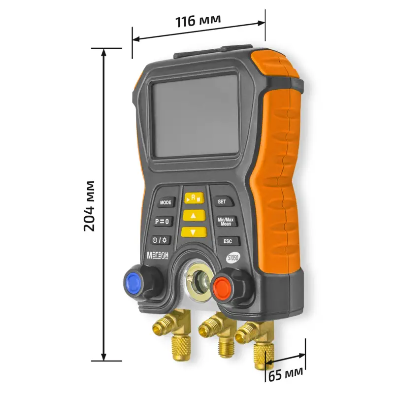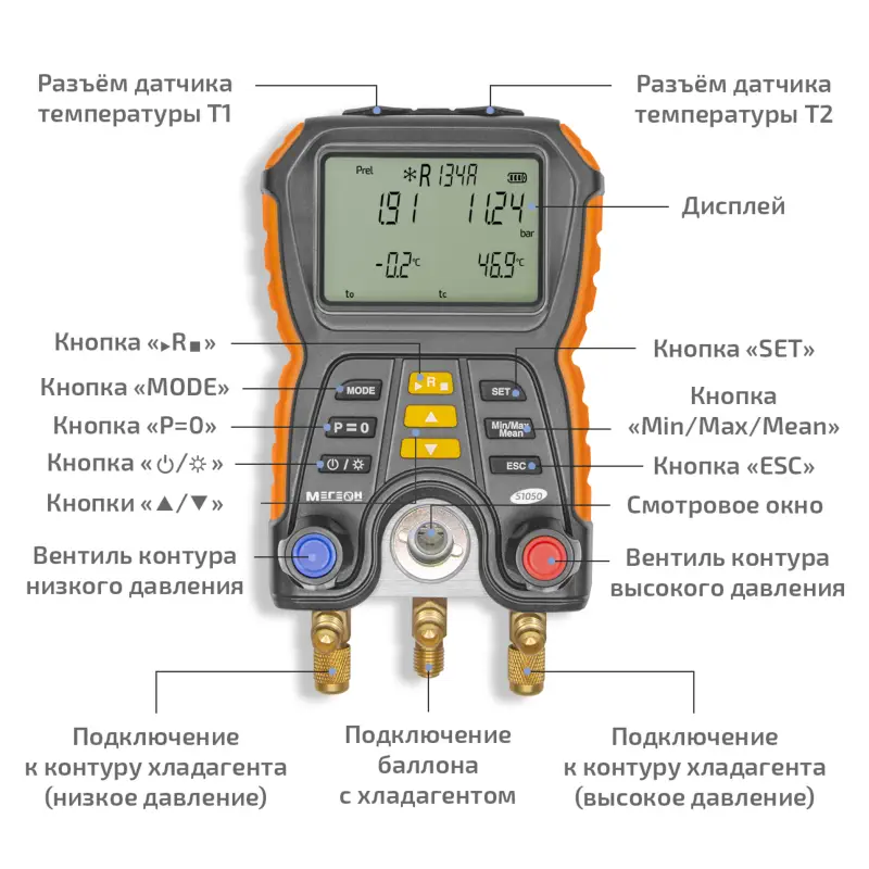 Цифровой манометрический коллектор МЕГЕОН 51050 представляет собой высокотехнологичное устройство, предназначенное для точного измерения давления и температуры в различных системах, включая системы кондиционирования и холодильные установки. Этот коллектор оснащен двумя входами, что позволяет одновременно контролировать давление в двух разных точках системы.