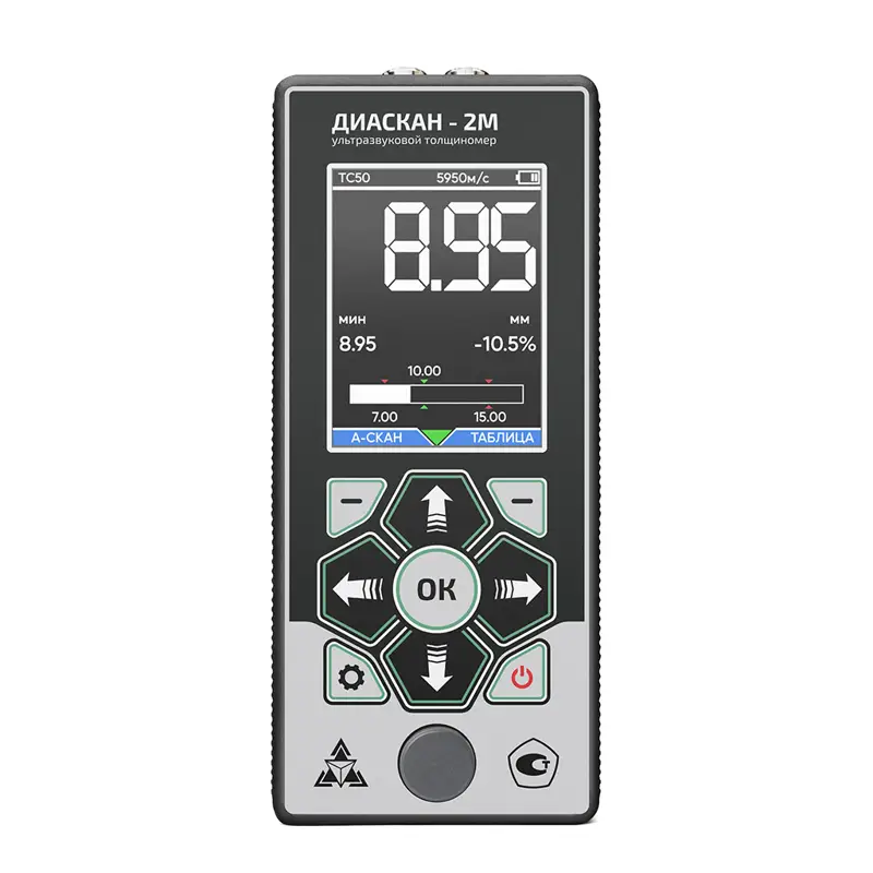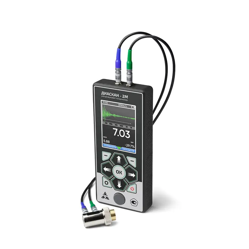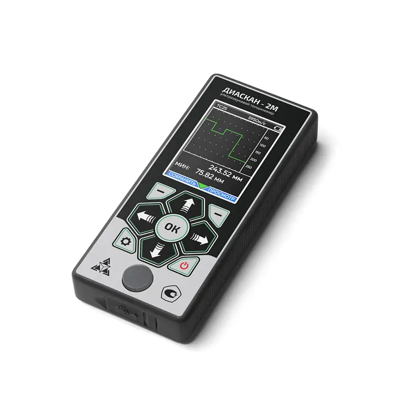 Ультразвуковой толщиномер "Техно-НДТ ДИАСКАН-2М" с преобразователями на 5 МГц и 10 МГц - это продвинутый инструмент для замера толщины материалов, который не повреждает их. Он использует ультразвук, чтобы проверять изделия, и даёт точные показания даже в трудных условиях.