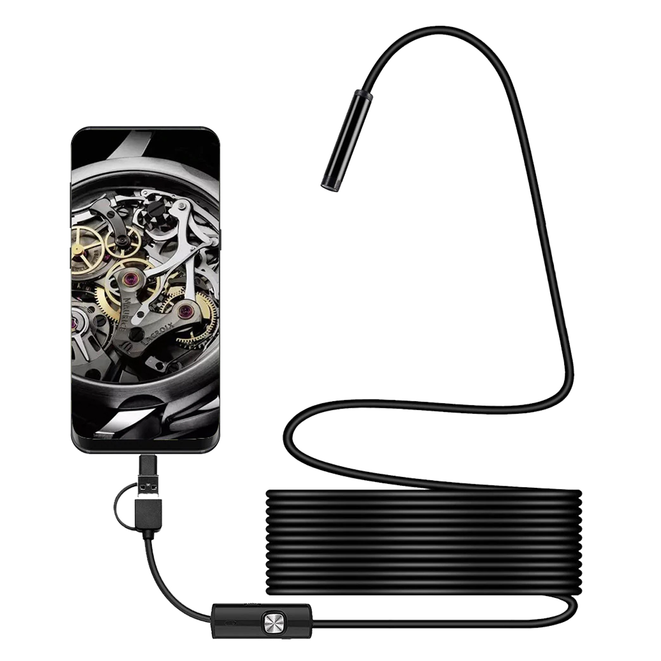 МЕГЕОН 33103 – это многофункциональный видеоскоп с ультратонкой камерой диаметром пять с половиной миллиметров, мягким зондом длиной 10 метров, оснащён универсальной вилкой три в одной позволяющей без использования сторонних переходников подключать его к гнёздам USB, microUSB и USB-type-C. Видеокамера высокой чёткости с защитой (IP67), со встроенной регулируемой светодиодной подсветкой, автоматической регулировкой фокуса и яркости. Он не требует источника питания так как подключается к порту и питается от него. В комплекте поставки: съёмное зеркало (перископ) для обзора по бокам, магнитный держатель и крючок для возможности извлечь упавшую деталь. В зависимости от используемого ПО возможна видео- и фотофиксация изображения. Прибор найдёт широчайшее применение там, где в труднодоступных местах нужно увидеть без дополнительной разборки.